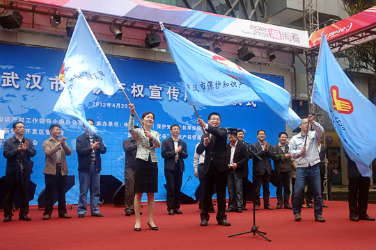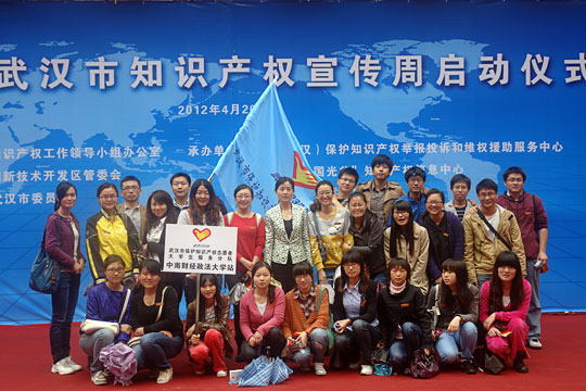 2012年4月20日下午,“2012年武汉市知识产权宣传周启动仪式”在光谷步行街下沉广场举行。本次启动仪式由武汉市知识产权工作领导小组办公室、武汉东湖新技术开发区管委会、共青团武汉市委员会主办,中国(武汉)保护知识产权举报投诉和维权援助服务中心、“武汉”中国光谷知识产权信息中心、武汉青年志愿者协会承办。来自武汉大学、华中科技大学、中南财经政法大学、华中师范大学的青年志愿者们积极参加了此次启动仪式。中南财经政法大学知识产权学院院长助理黄玉烨教授带领全体知识产权学院2011级研究生志愿者参加了本次仪式。其中,2011级知识产权研究生周宇代表全体青年志愿者宣读了“保护知识产权倡议书”。