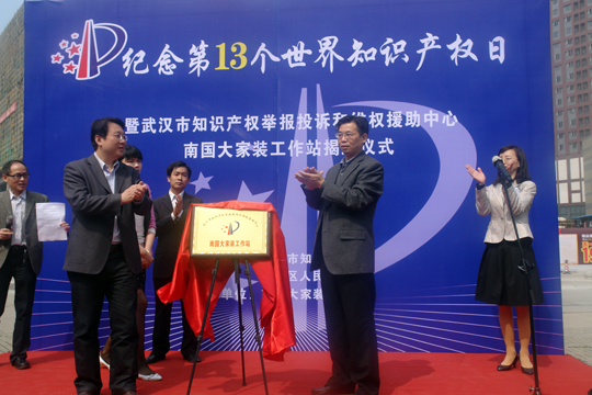 2013年4月26日,“纪念第13个世界知识产权日暨武汉市知识产权举报投诉和维权援助中心南国大家装工作站揭牌仪式”在南国大家装广场隆重举行。武汉市知识产权维权援助中心、硚口区人民政府、南国大家装有限责任公司等单位的领导、嘉宾同志和中南财经政法大学知识产权研究中心志愿者参加了揭牌仪式。这标志着知识产权举报投诉和维权援助中心南国大家装工作站正式投入运行。
