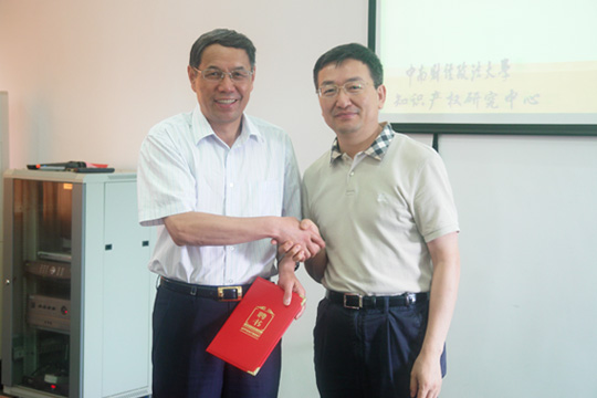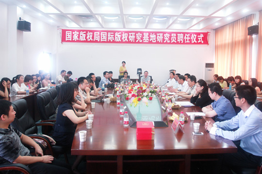 2013年6月9日上午9点,“国家版权局国际版权研究基地研究员聘任仪式”在中南财经政法大学南湖校区文泓楼四楼会议室举行。聘任仪式由曹新明教授主持,国家版权局版权管理司于慈珂司长、管理司国际处邓玉华处长,基地研究员代表华东政法大学王迁教授、上海交通大学万勇副教授、对外经济贸易大学卢海君副教授,以及中南财经政法大学知识产权研究中心教师和学生参加了此次仪式。
