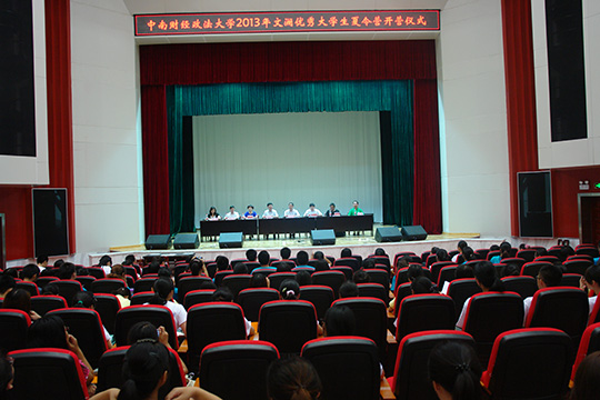 2013年7月12日上午,文澜优秀大学生夏令营(知识产权分营)开营仪式在艺体中心1号报告厅举行,参加此次开营仪式的领导有中南财经政法大学党委副书记齐文远教授,中南财经政法大学党委副书记周景明教授,学校党委研究生工作处处长、研究生院副院长周佳玲女士,法学院院长方世荣教授,刑事司法学院院长夏勇教授,新闻与文化传播学院院长胡德才教授,外国语学院副院长王娜副教授。