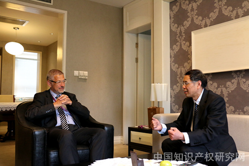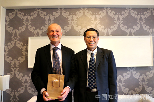 吴汉东教授随后与澳大利亚国立大学知识管理与发展中心主任Peter Drahos教授进行了会面。两人如同许久不见的老友般,一见面就进行了亲密的交谈。中心向来十分重视同Peter Drahos教授及其研究机构的合作,曾派博士生陈默到Peter Drahos教授那里交流学习。Peter Drahos教授表示非常开心能够来到中国参加南湖论坛,并对陈默博士的研究成果给予了充分的肯定。Peter Drahos教授的著作《知识财产法哲学》在中国产生了很大的影响,会谈中吴汉东教授特意提及,自己新近出版的论文集中多次对Peter Drahos教授的理论进行了介绍。