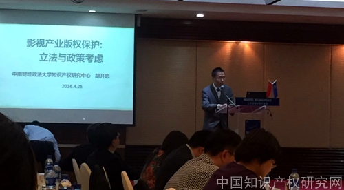 知识产权研究中心副主任、国家版权局国际版权研究基地副主任胡开忠教授应邀参加了该论坛,并就“影视产业的版权保护:立法与政策考虑”问题进行主题演讲,分析了影视产业的发展现状、影视产业版权保护的现状,指出了影视产业在版权保护中存在的问题,并提出了促进影视产业版权保护立法和执法完善的建议。