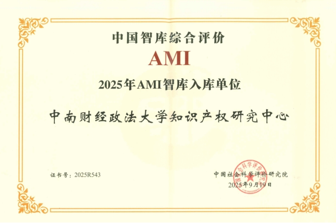 近日,中国社会科学评价研究院正式公布“中国智库综合评价研究项目(2025)”AMI智库入库名单,中南财经政法大学知识产权研究中心成功入选,充分彰显了中心在特色新型智库建设领域的综合实力与鲜明优势。