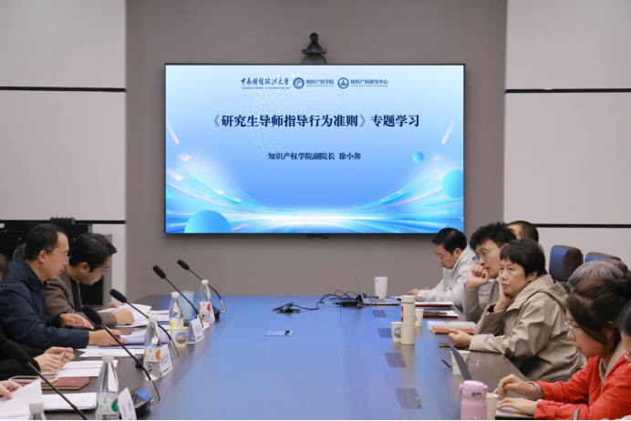 2025年10月20日下午,知识产权学院副院长、知识产权法学术型硕士生导师组副组长徐小奔教授组织全体教职工开展《研究生导师指导行为准则》专题学习,旨在强化导师指导行为规范,夯实研究生培养责任基础。