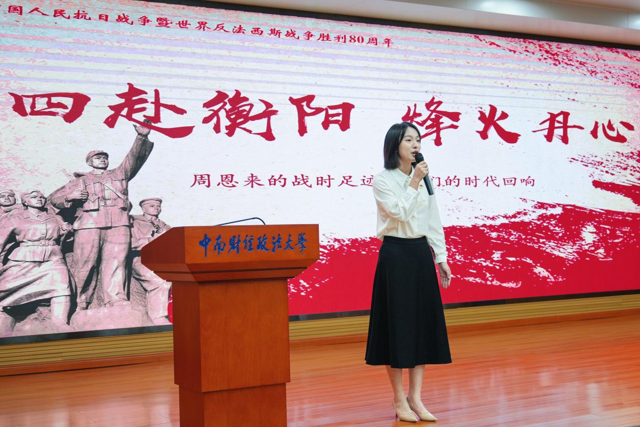 决赛中,刘璟仪以《四赴衡阳,烽火丹心——周恩来的战时足迹》为题开展宣讲。作为衡阳学子,她怀着深厚情感,带领观众重温1938至1939年间周恩来四次赴衡阳的烽火历程:从危局中部署抗日战略、建立八路军驻衡阳办事处,到长沙“文夕大火”后紧急折返为民请命、坚守“不搞特殊”的革命本色,再到深耕抗日骨干培育、以鲜明抗战论断开展全民精神动员,生动还原了伟人始终与人民同心、坚定抗日的赤子情怀与使命担当。此外她还将红色历史与中南财经政法大学校训“博文明理,厚德济世”相结合,并结合党的二十届四中全会精神发出号召,呼吁学子将个人理想融入国家大局,践行使命担当。