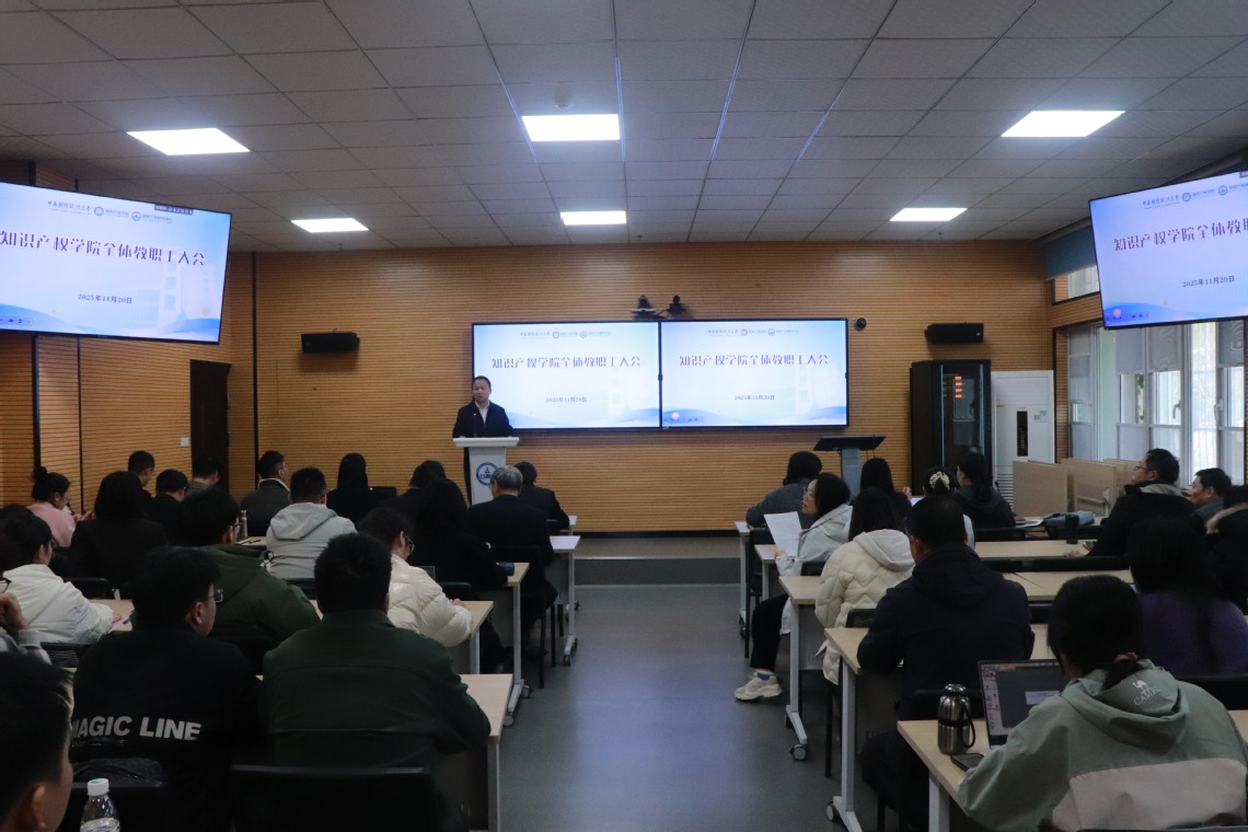 11月20日下午,知识产权学院召开全体教职工大会,集中部署学习宣传贯彻党的二十届四中全会精神、“平安留学”教育、师德师风建设、消防安全等重点工作。知识产权学院党政领导及全体教职工参加会议。会议由知识产权学院党委书记曹吉安主持。