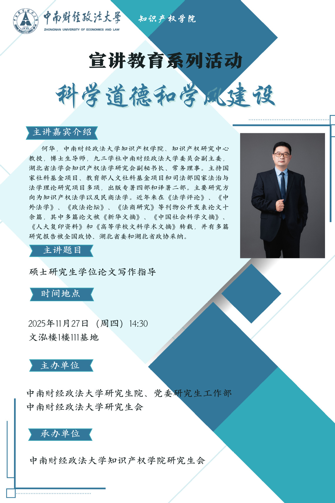 【活动预告】科学道德与学风建设宣讲教育会:硕士研究生学位论文写作指导