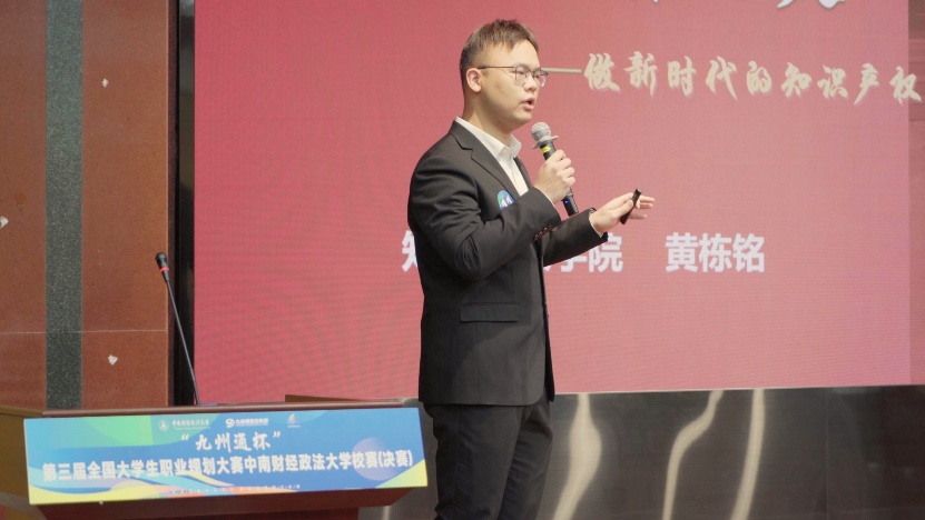 黄栋铭坚持以知识产权公益宣传为己任,结合个人省级志愿服务经历,详细回答了公益普法面向谁、做什么、怎么做的问题,力求成长为一名专注于知识产权宣讲的公职律师,荣获就业赛道研究生组二等奖。