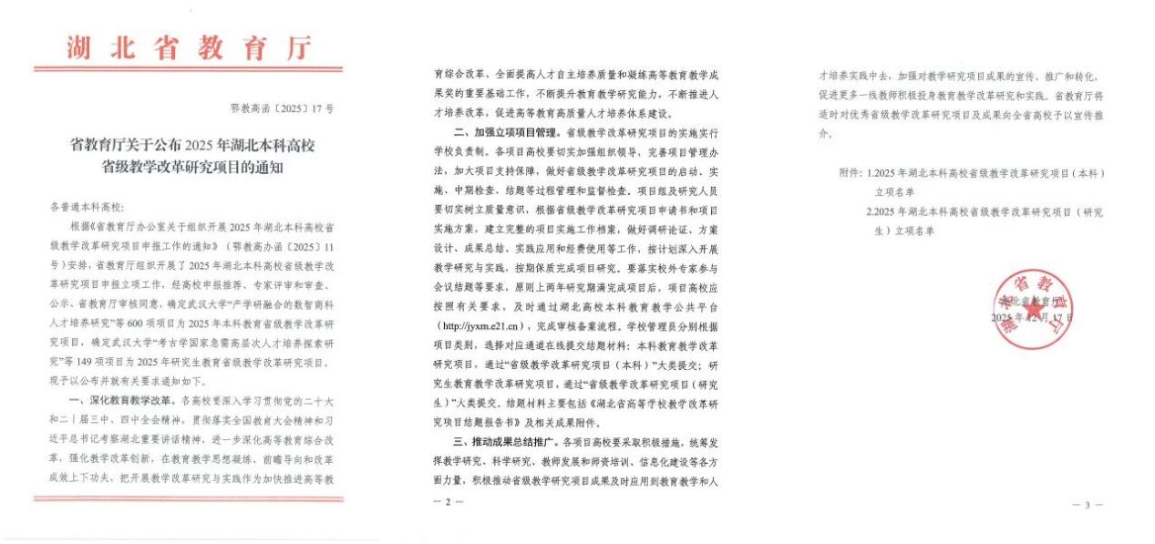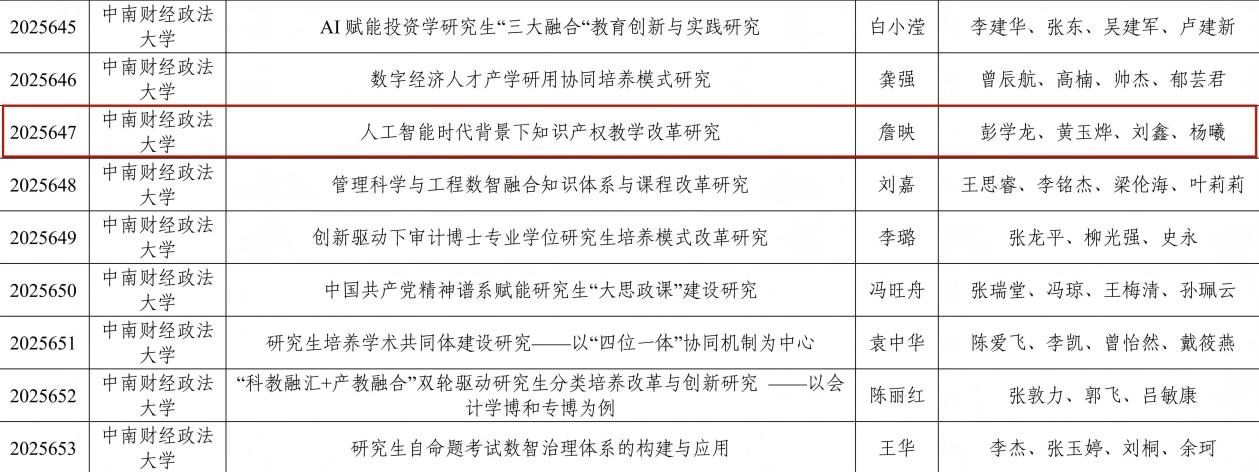 近日,湖北省教育厅发布《省教育厅关于公布2025年湖北本科高校省级教学改革研究项目的通知》(鄂教高函〔2025〕17号),我校凭借扎实的教研积淀与创新实践,成功获批9项省级研究生教学改革研究项目,其中包括我院詹映教授主持申报的“人工智能时代背景下知识产权教学改革研究”项目。此次立项,既是对我院研究生教育教学改革工作的高度认可,更是学院深耕知识产权领域教研、主动对接时代发展前沿的重要成果彰显。