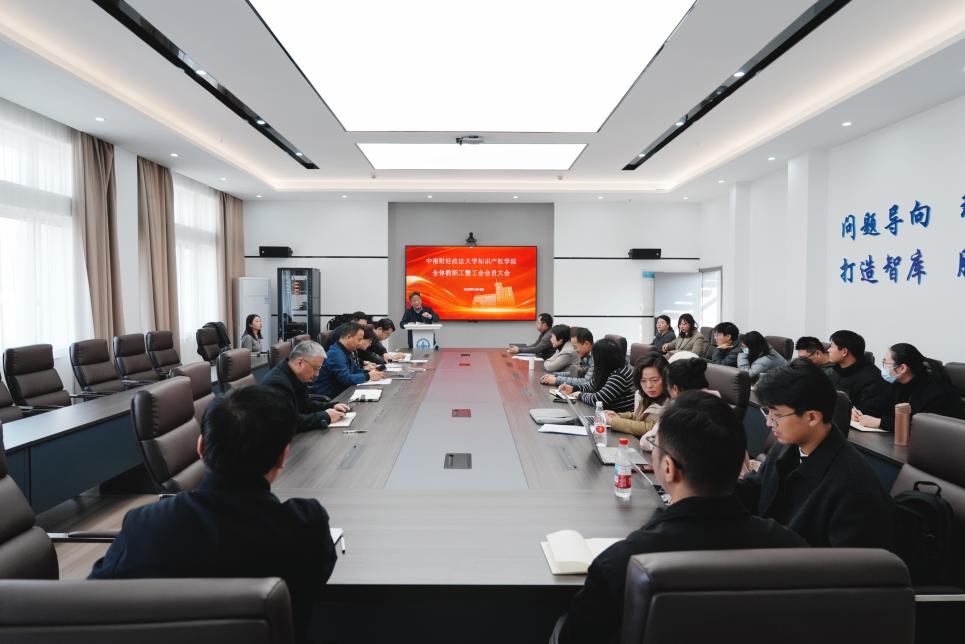 2026年1月15日下午,中南财经政法大学知识产权学院教职工暨工会会员大会在文泓楼四楼会议室顺利召开,学院全体领导班子与全院教职工齐聚一堂,全面总结2025年工作成效,系统部署2026年目标任务,共同擘画“十五五”发展蓝图,为学院高质量发展凝聚奋进力量。会议由知识产权研究中心主任彭学龙教授主持。