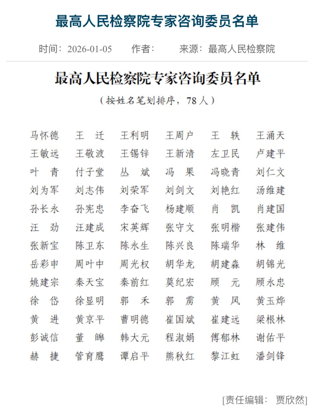 2026年1月5日,最高人民检察院公布新一届专家咨询委员名单,共78位专家学者入选。中南财经政法大学知识产权学院院长黄玉烨教授、法学院黎江虹教授受聘为第五届最高人民检察院专家咨询委员。同时,我校王利明、王锡锌、刘为军、刘艳红、张明楷、顾元、黄进(按姓名笔画排序)七位校友亦名列其中。