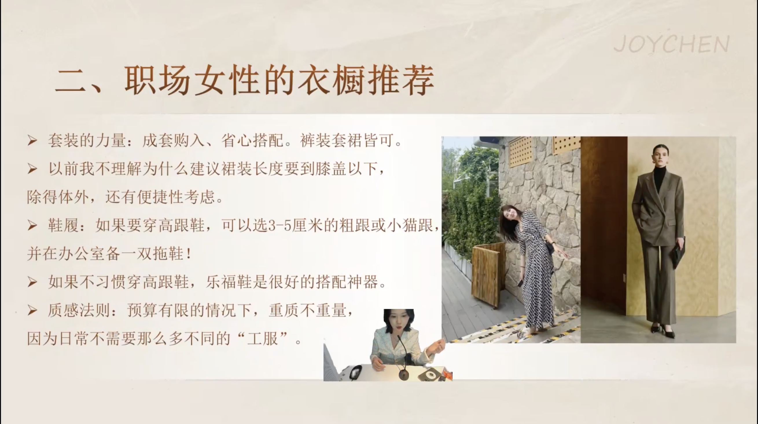 第二位分享嘉宾是2020级硕士陈佳露师姐。陈师姐曾在上海执业从事律师工作,现为三文文化创始人,同时也是小红书知名法律博主@小耳东东东、APEC青年企业家及Tedx演讲者。作为已经走出校园、在不同职业赛道不断探索的校友代表,陈师姐结合自己的职业经历,分享了职场穿搭与创业经验。强调了职场形象的重要性,认为职场形象能降低沟通成本,帮助筛选客户和获得定价权。她分享了不同预算的职场穿搭品牌,并推荐了定制正装。接下来陈师姐介绍了她的创业经历,分享了自己对于如何选择职业道路的思考,以及从律师转型为自媒体博主再到创业公司创始人的创业契机和经验。