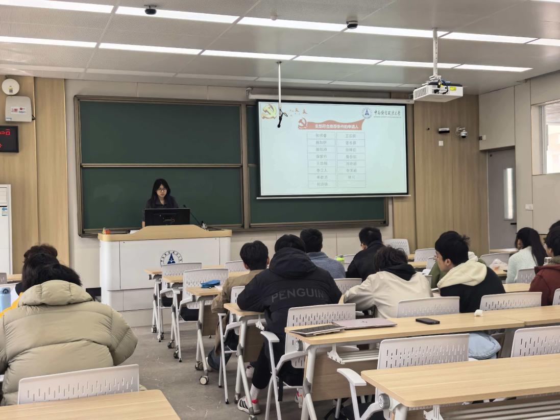 (通讯员:张明睿)为扎实做好党员发展后备力量培育工作,严格规范团内推优入党工作流程,3月25日上午,知识产权2501团支部于文澜楼311教室召开入党推优大会。本次大会由团支书张明睿主持,团支部24名团员全员到场参会。