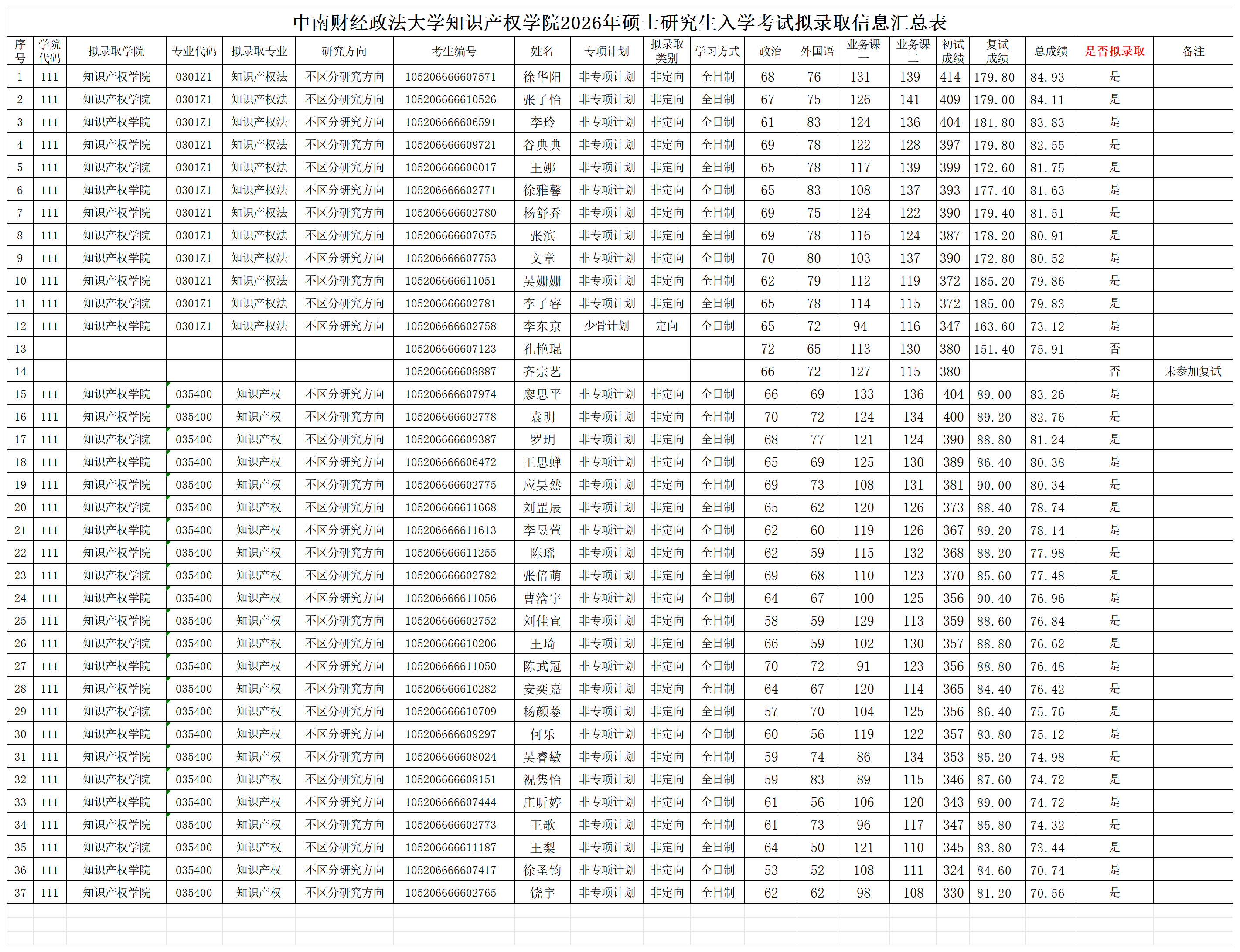 按教育部及学校2026年硕士研究生招生复试工作相关规定,经知识产权学院专家复试,学院招生工作领导小组会议审议并通过,现将我院2026年硕士研究生入学考试拟录取情况进行公示,拟录取名单详见附件。