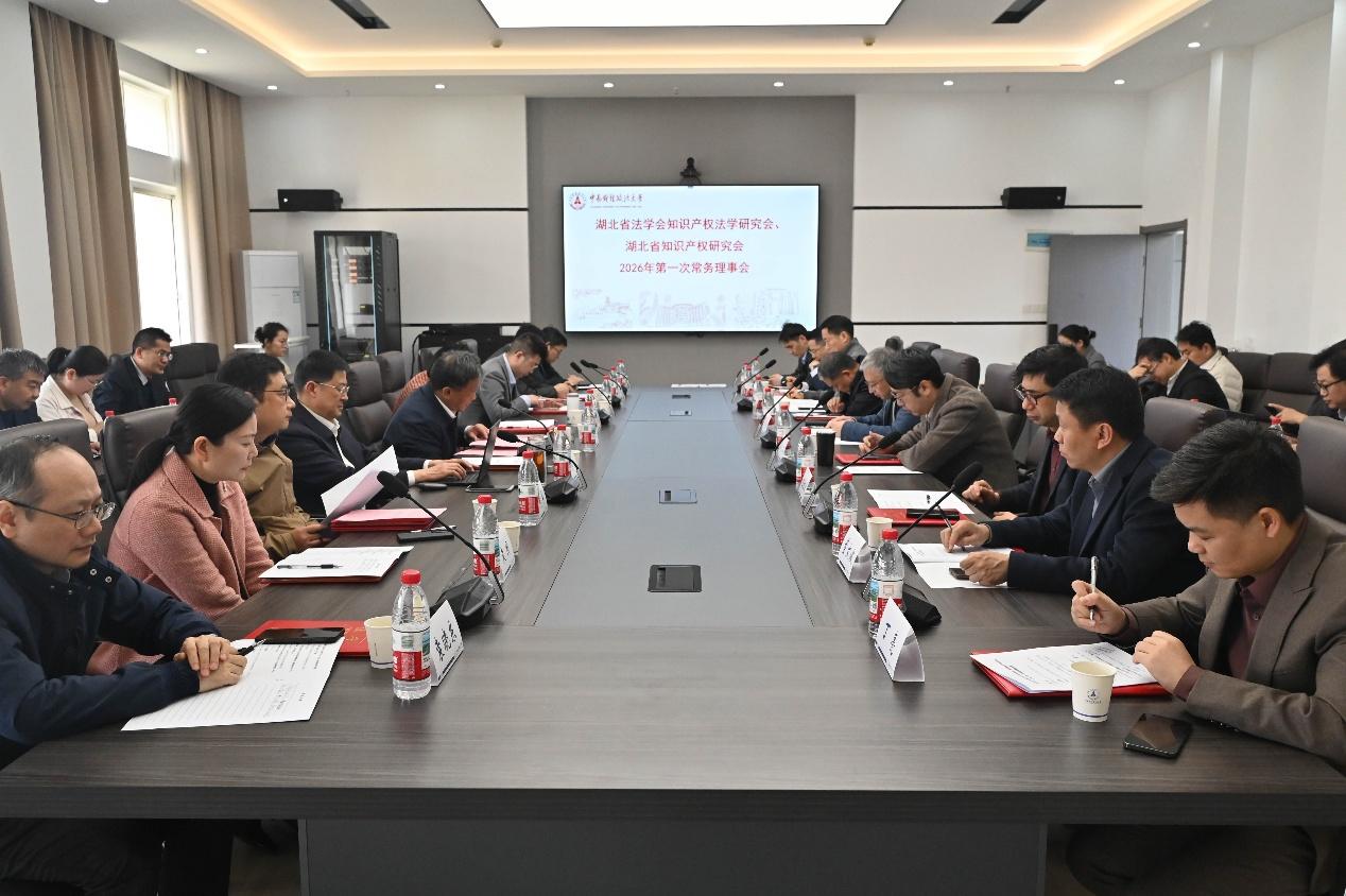 3月28日上午,湖北省法学会知识产权法学研究会、湖北省知识产权研究会2026年第一次常务理事会在中南财经政法大学文泓楼四楼会议室顺利召开。会上,湖北省法学会知识产权法学研究会会长、湖北省知识产权研究会理事长、中南财经政法大学知识产权研究中心主任彭学龙教授带领与会人员学习领会2026年全国两会关于知识产权工作的重要精神并作重要讲话,湖北省知识产权研究会副理事长兼秘书长常务理事何华教授主持会议。